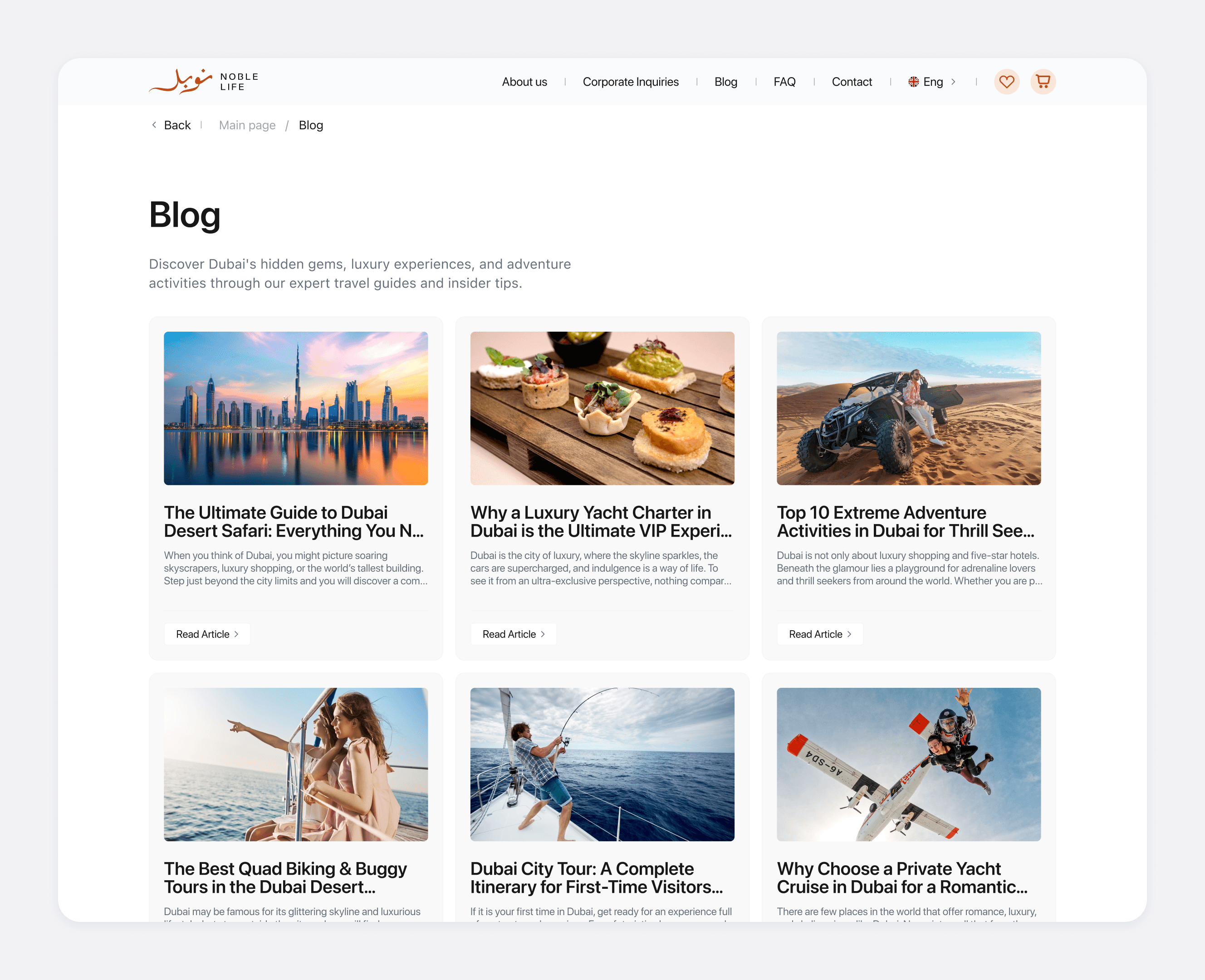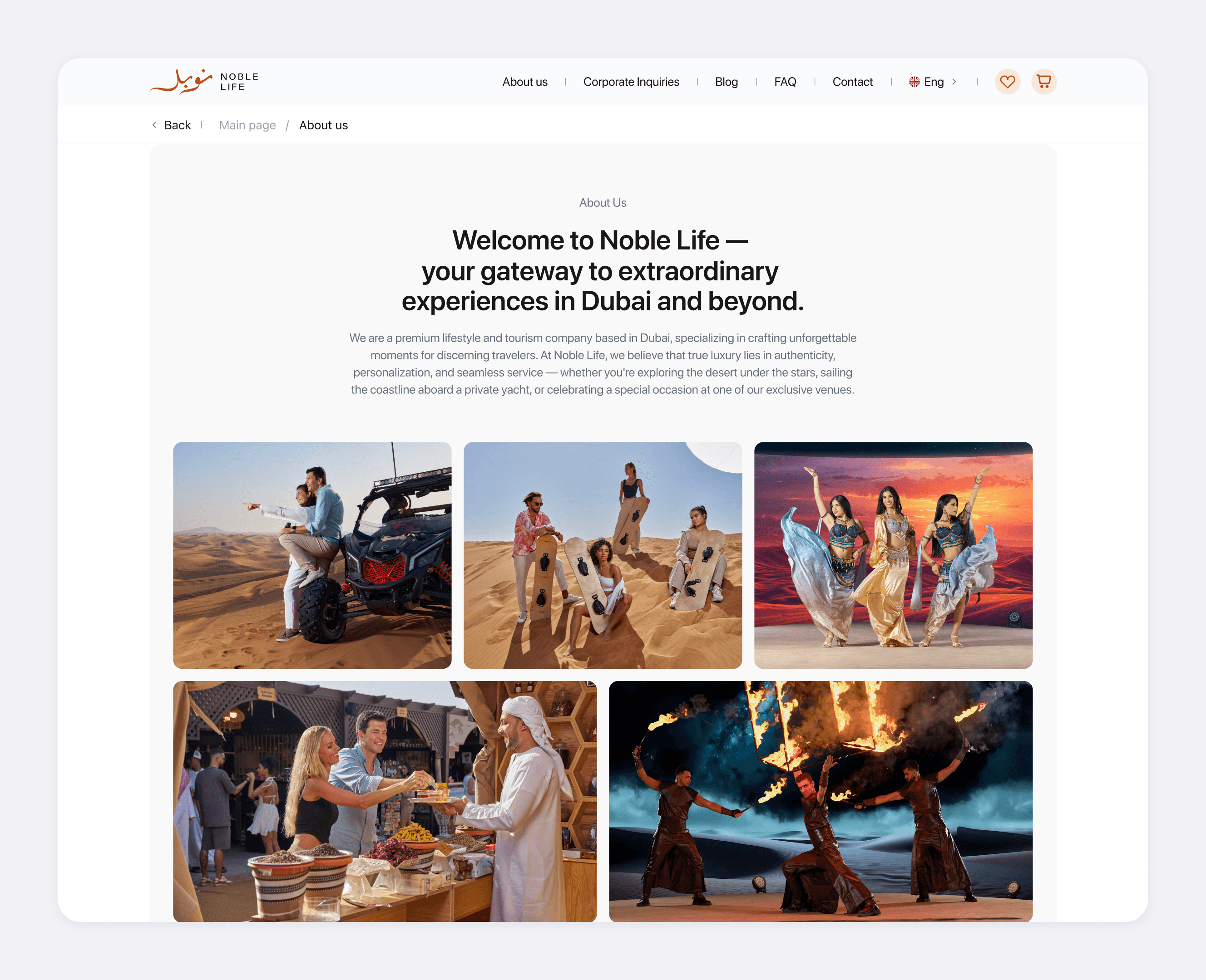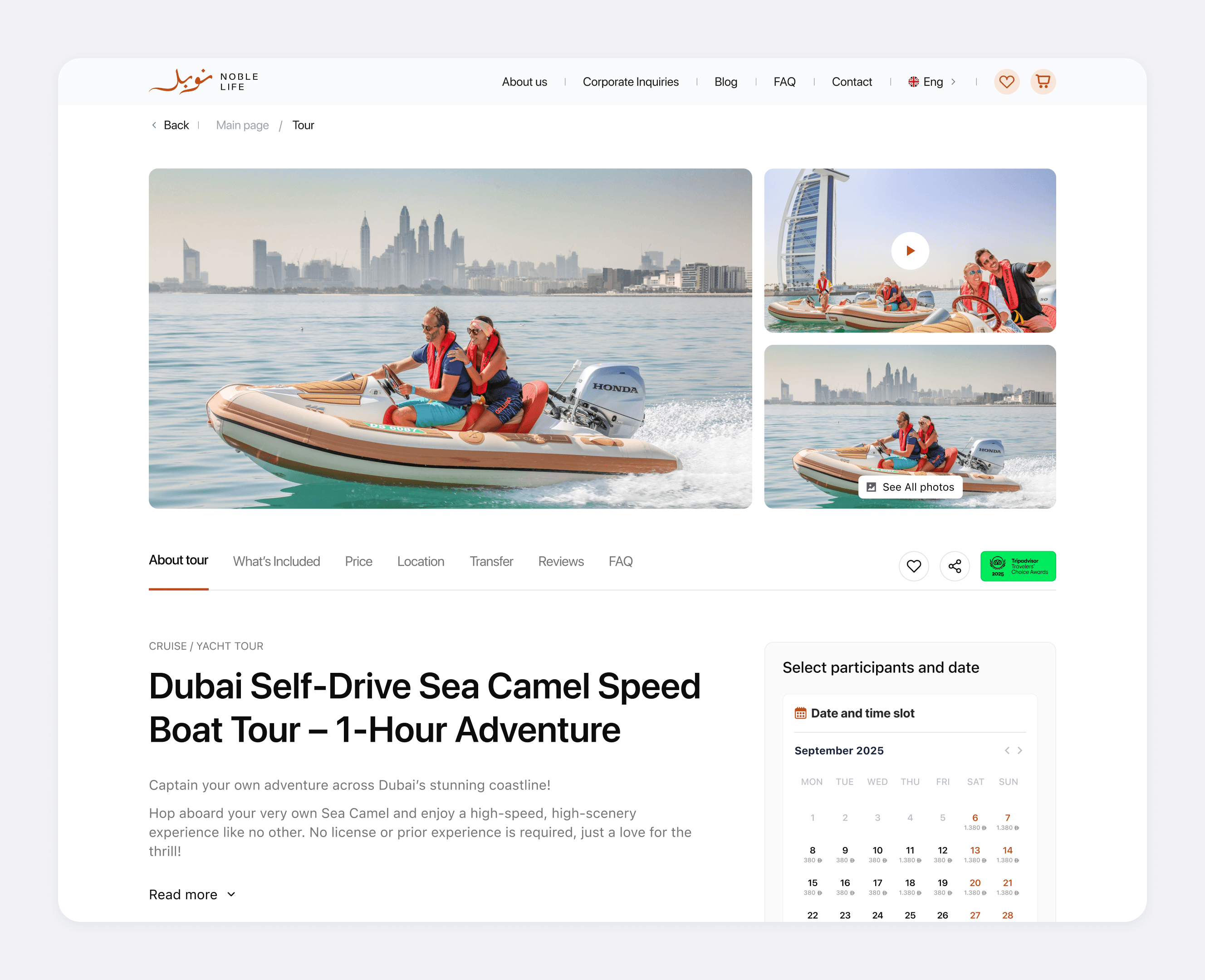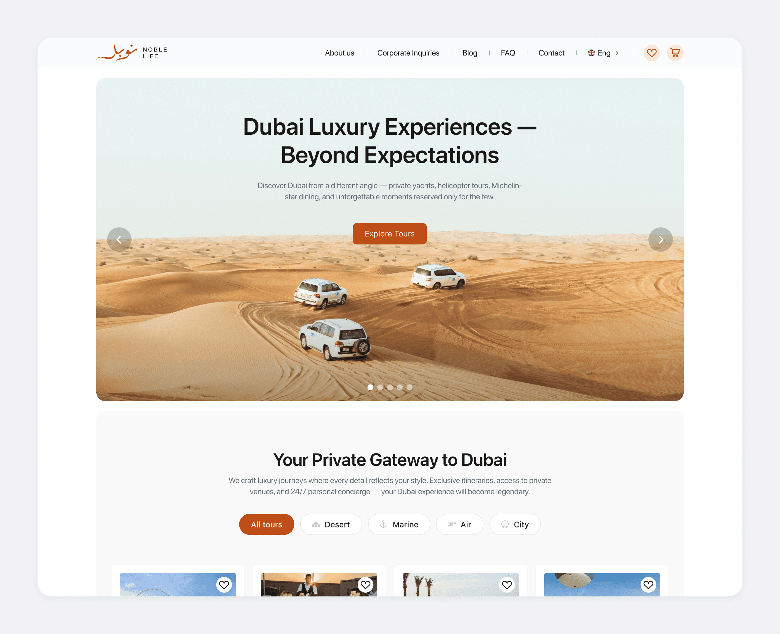• Разработать структуру и информационную архитектуру сайта, чтобы легко представить широкий спектр услуг: сафари, шоу, туры, яхты, приватные мероприятия — и пользователи могли быстро ориентироваться и совершать бронирование. • Создать визуальный стиль, отражающий премиум-класc, атмосферу путешествия, приключения и эксклюзивности: крупные яркие фото, контрастный, но элегантный дизайн, лаконичные компоненты, подчёркивающие статус бренда. • Обеспечить простой и удобный путь пользователя: от первого визита — через выбор услуги, просмотр деталей, до бронирования — с минимальными барьерами, чёткими CTA и понятной навигацией.
